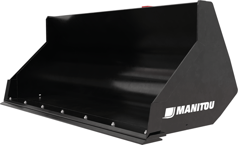 Utilisation : conçu pour les chariots télescopiques rotatifs (MRT), ce godet est idéal pour la manutention de matériaux en vrac comme les graviers, la terre ou les déchets de chantier