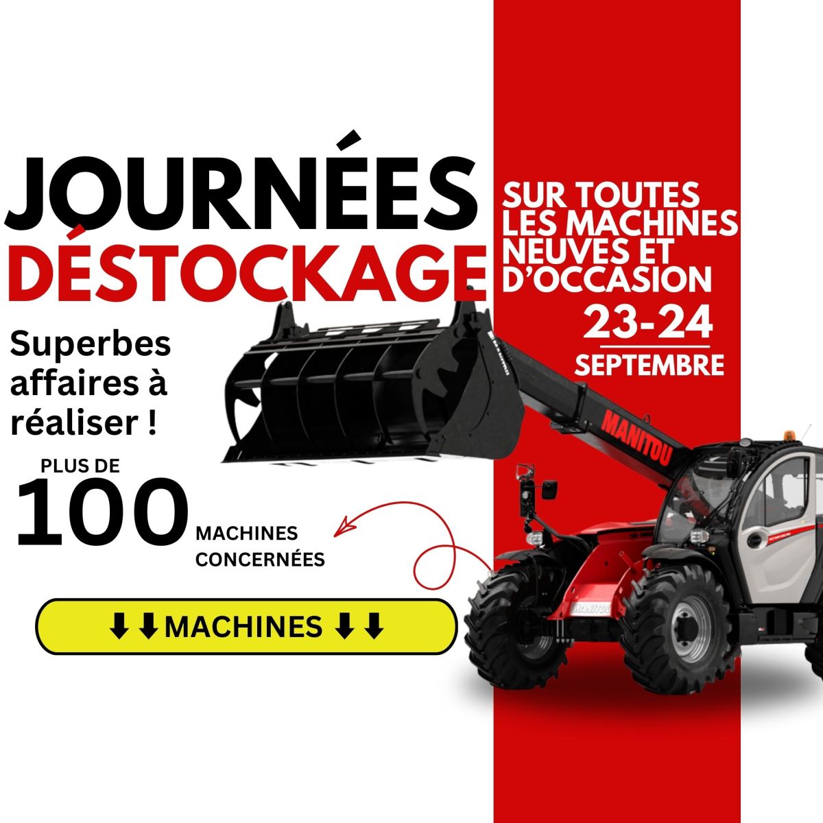 Ces 23 & 24 Septembre, ne manquez pas nos journées exceptionnelles de déstockage ! C’est l’occasion idéale pour réaliser de véritables affaires sur une large sélection de machines neuves et d'occasion.